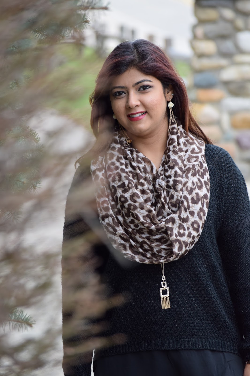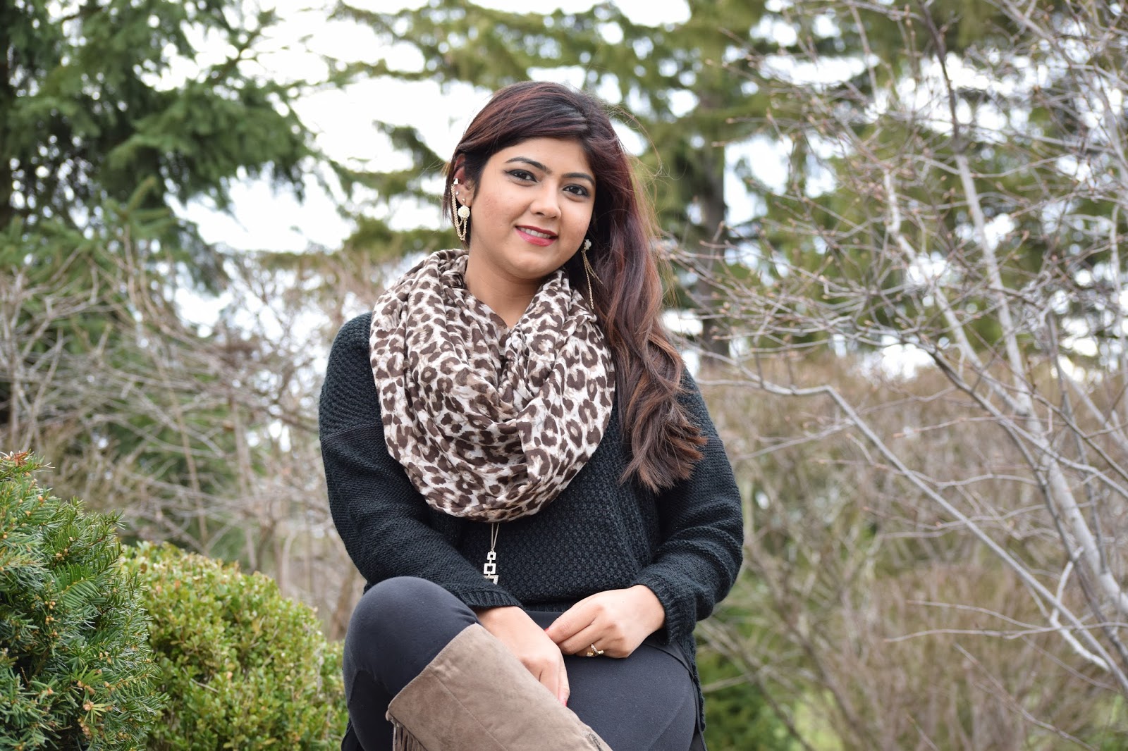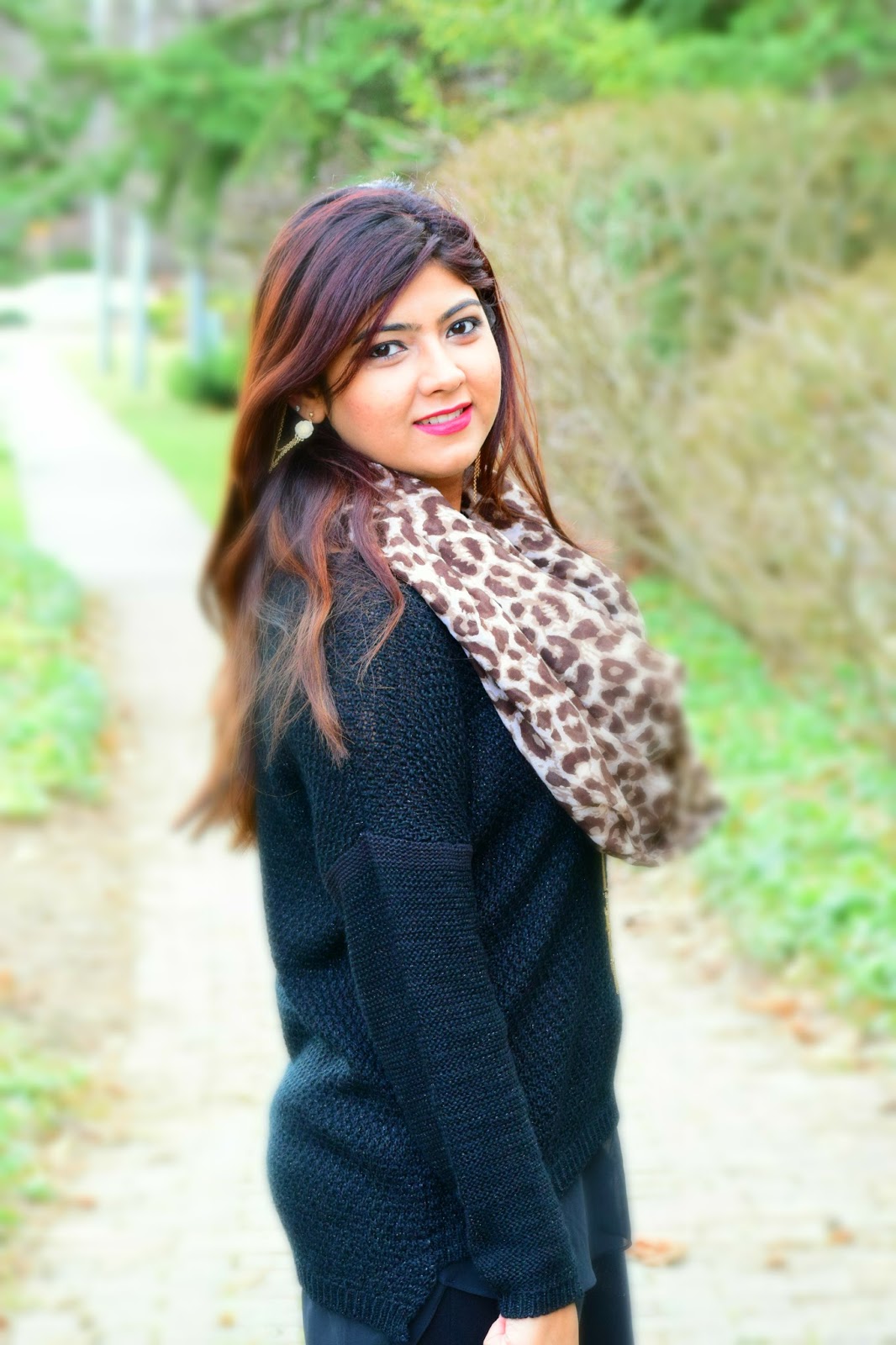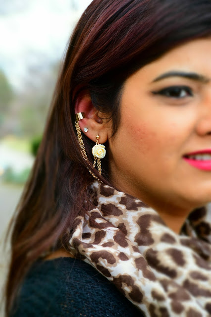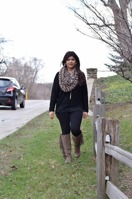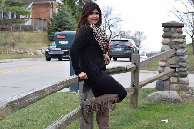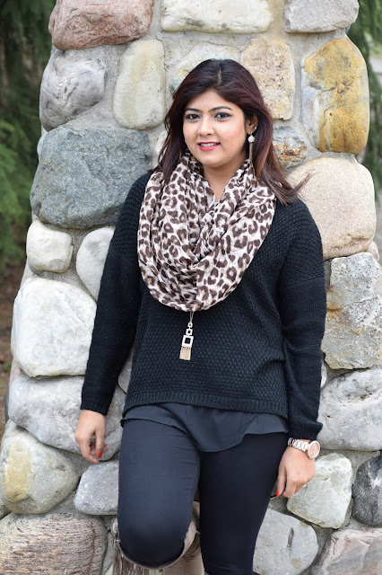 Today’s dress is all about Black and I think it really goes well with Gold and Brown. So I chose an over-sized pullover and paired it with a skinny leggings and a leopard print scarf turned it into an infinity scarf.I wore it with my tassel cowboy boots which I feel looks so chic and is one of my favs. Ok enough of my ranting… Lets get started!!!