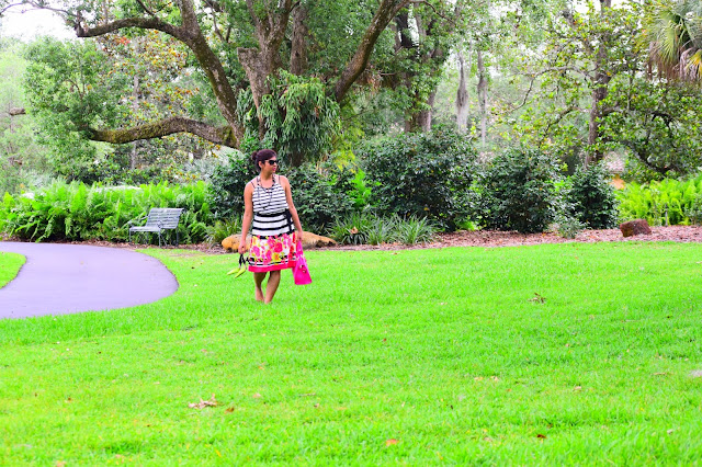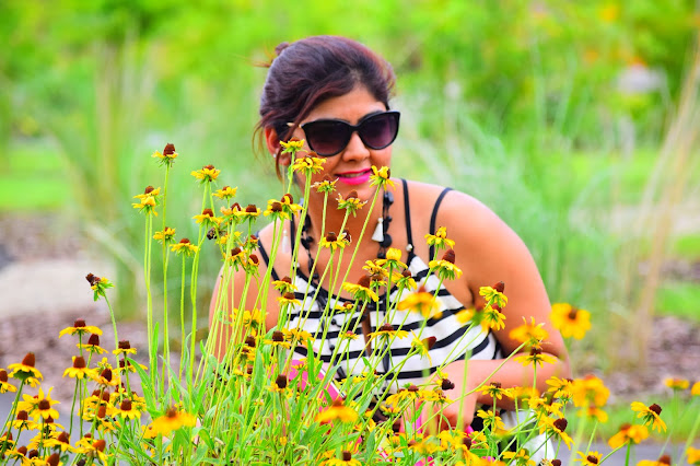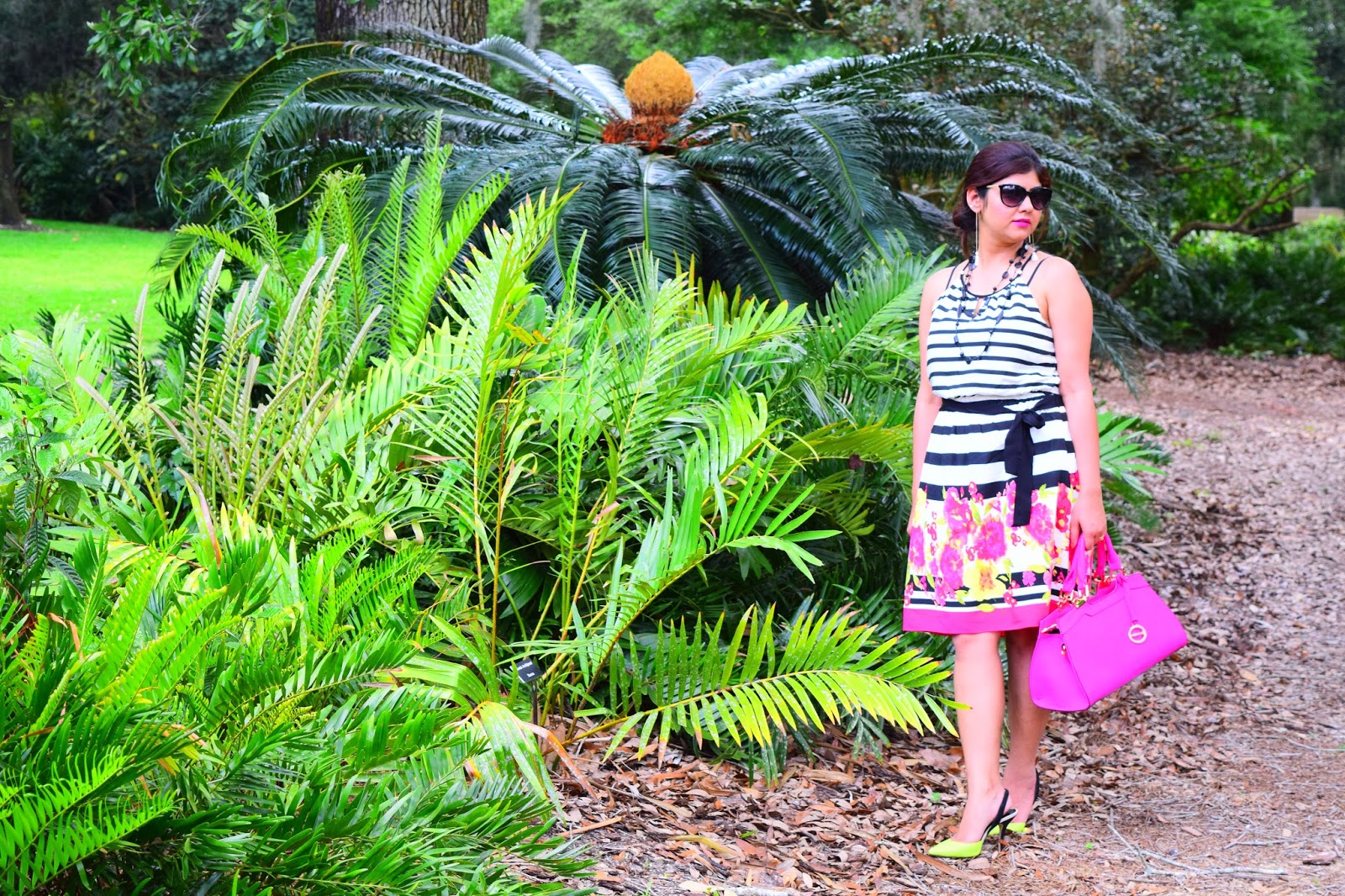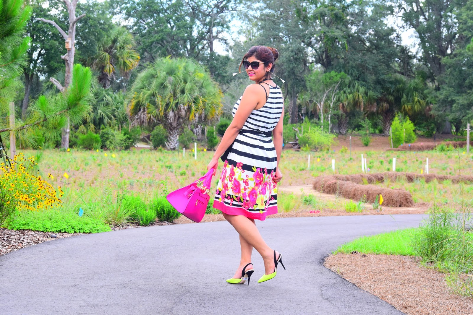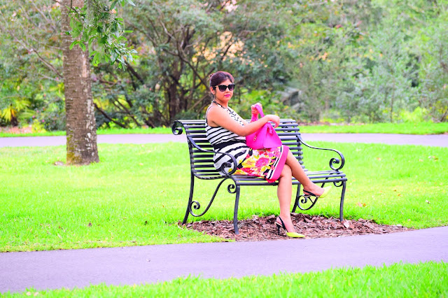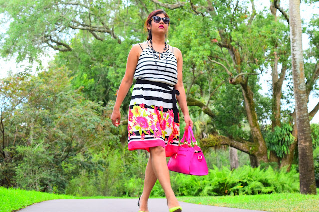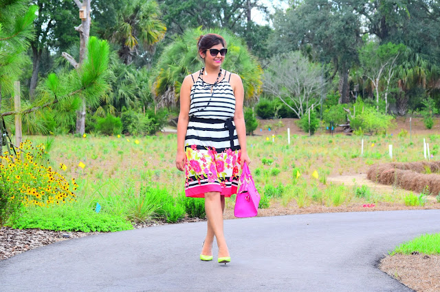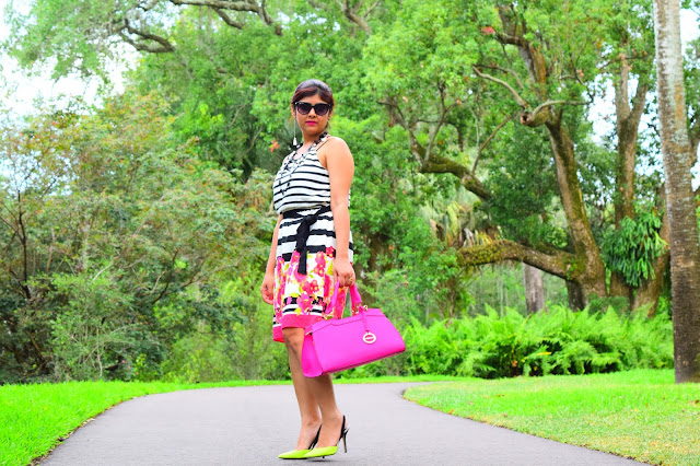 I am totally obsessed with my current outfit… Love how beautifully colors are incorporated and blended with black and white stripes! The fitting is awesome and the dress hits just right at the knee!!Combined it with my pretty Aldo shoes and my hot pink bag, I am all set to twirl. Since the day was super hot, i just bundled all my hair into a messy bun. 🙂 Hope you like this look and have a wonderful week ahead.