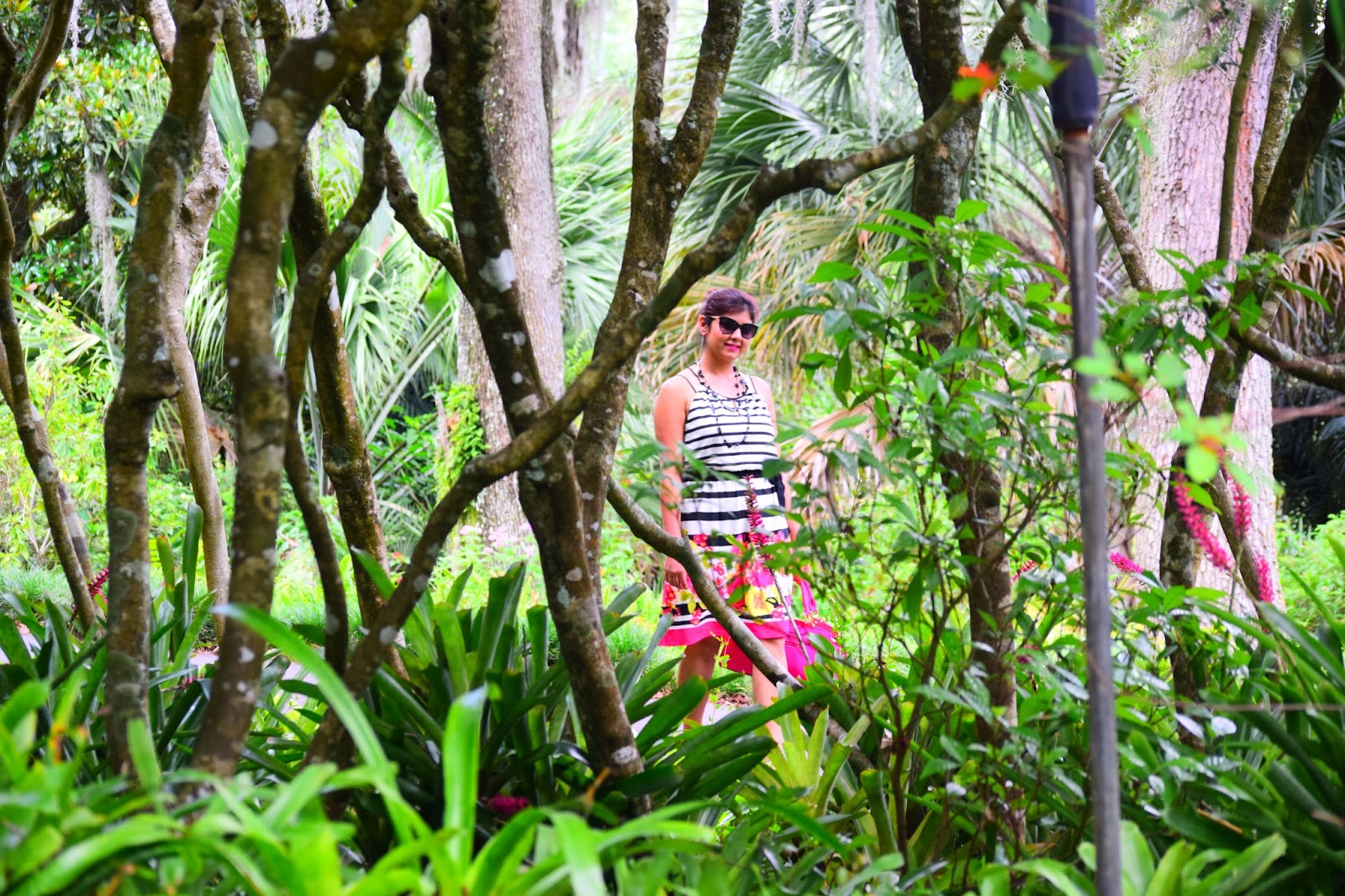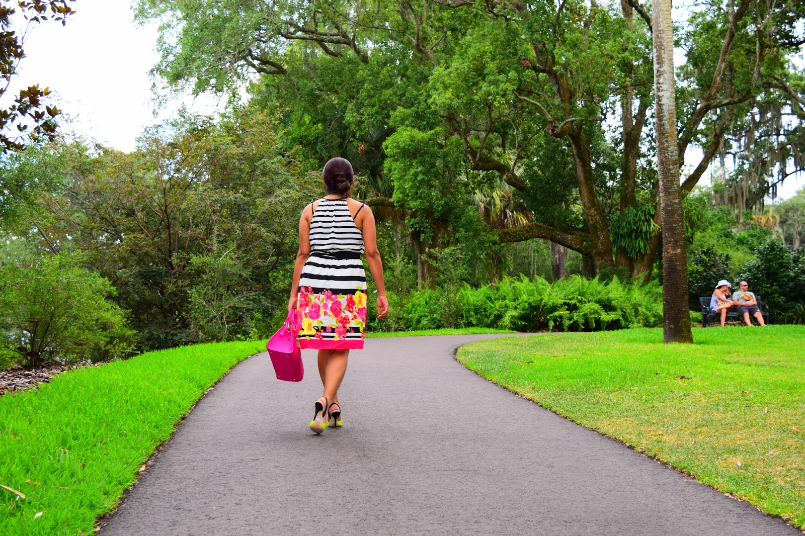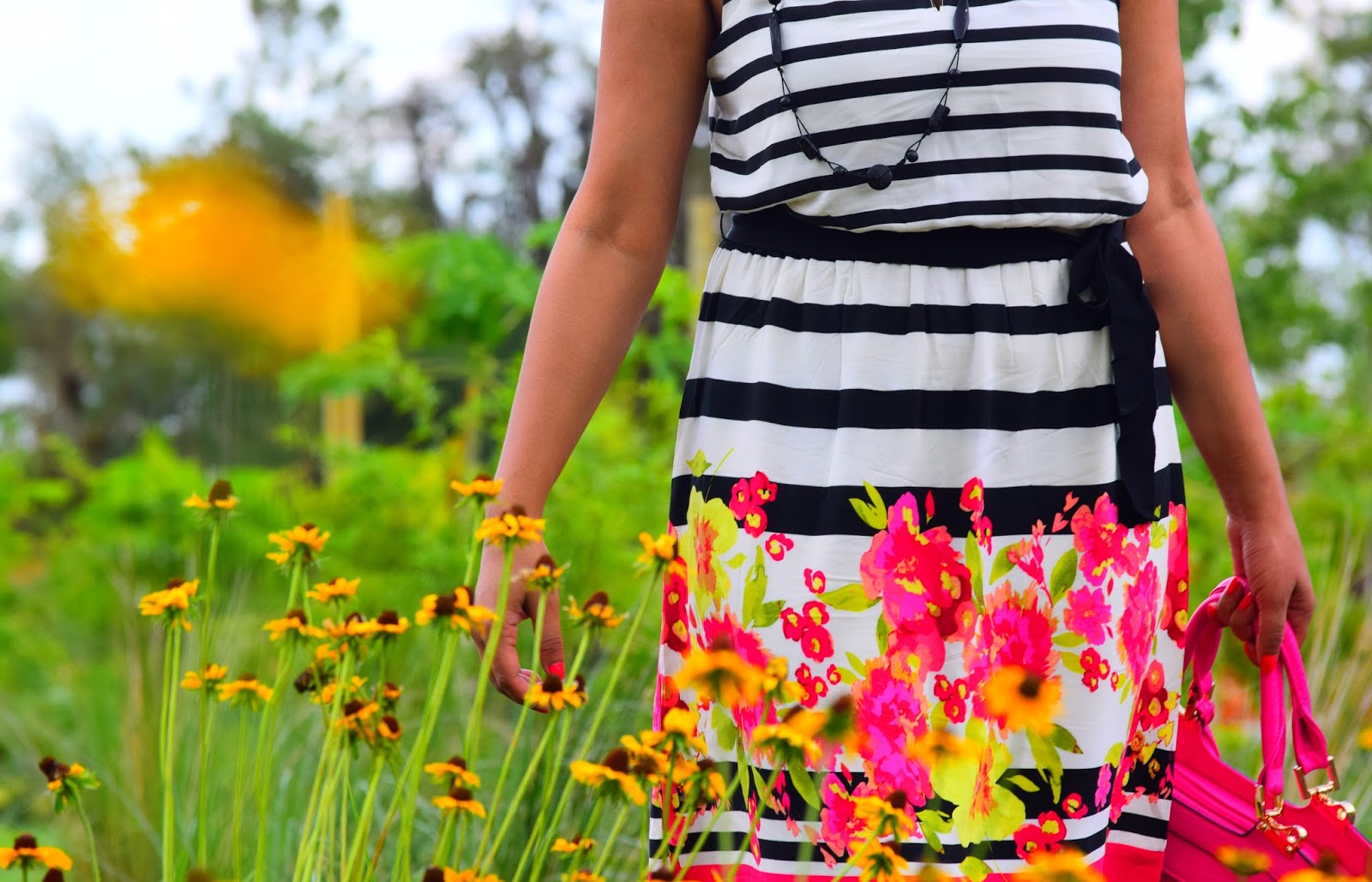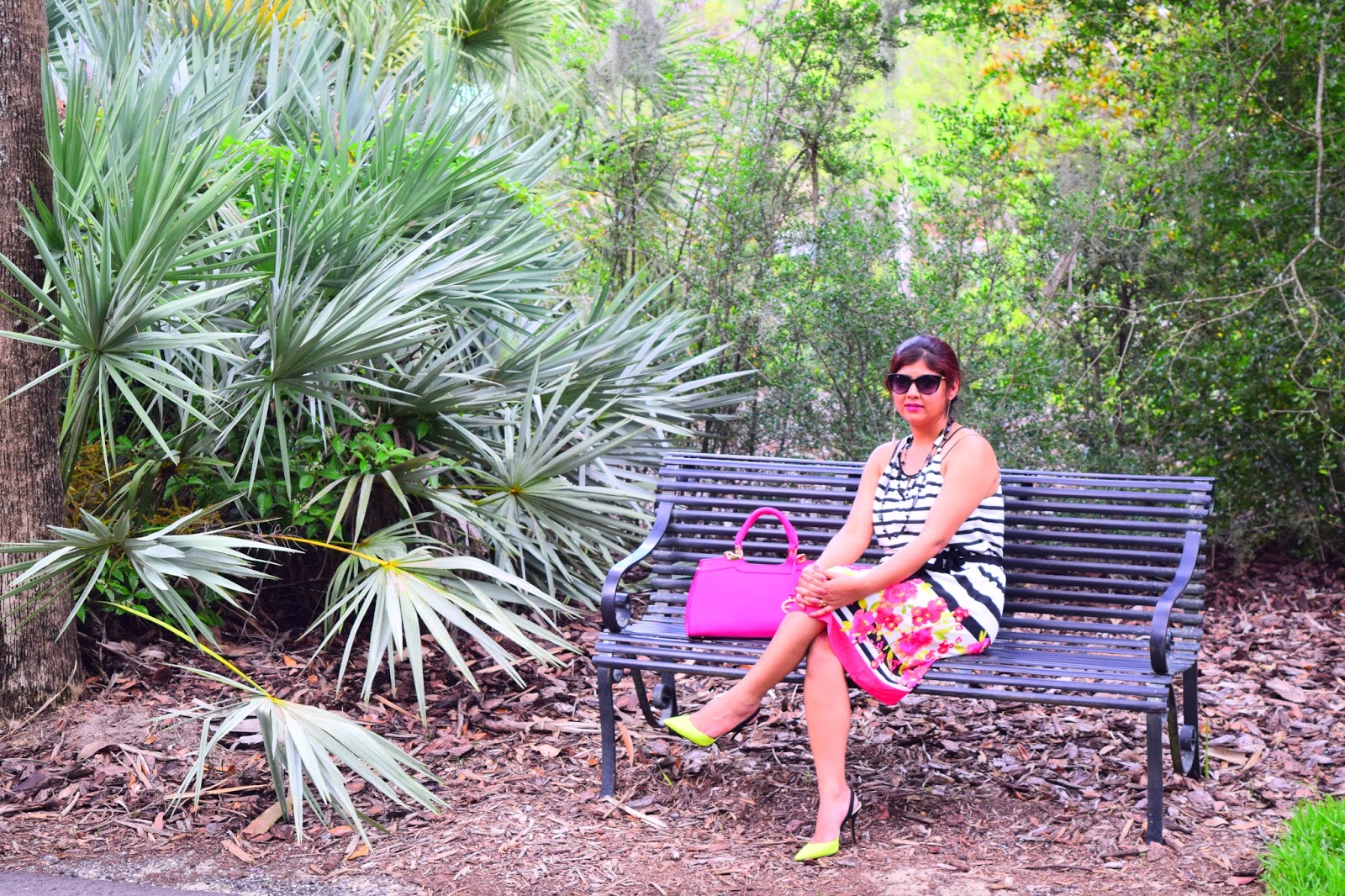I am totally obsessed with my current outfit… Love how beautifully colors are incorporated and blended with black and white stripes! The fitting is awesome and the dress hits just right at the knee!!Combined it with my pretty Aldo shoes and my hot pink bag, I am all set to twirl. Since the day was super hot, i just bundled all my hair into a messy bun. 🙂 Hope you like this look and have a wonderful week ahead.