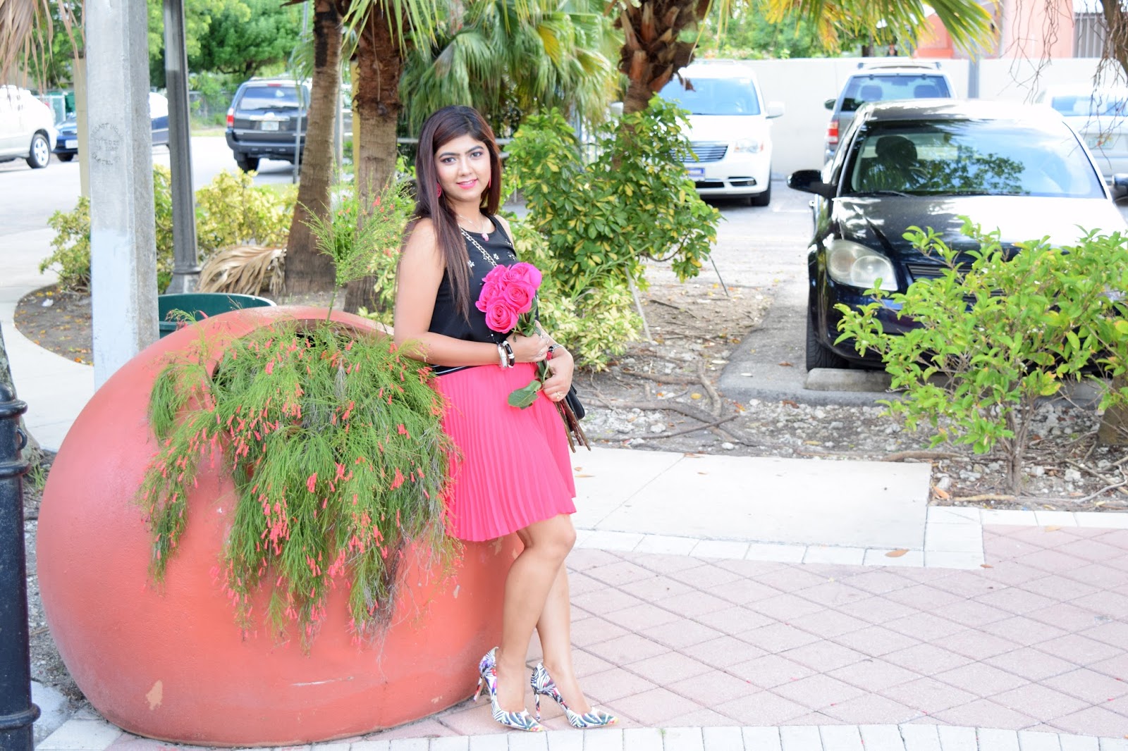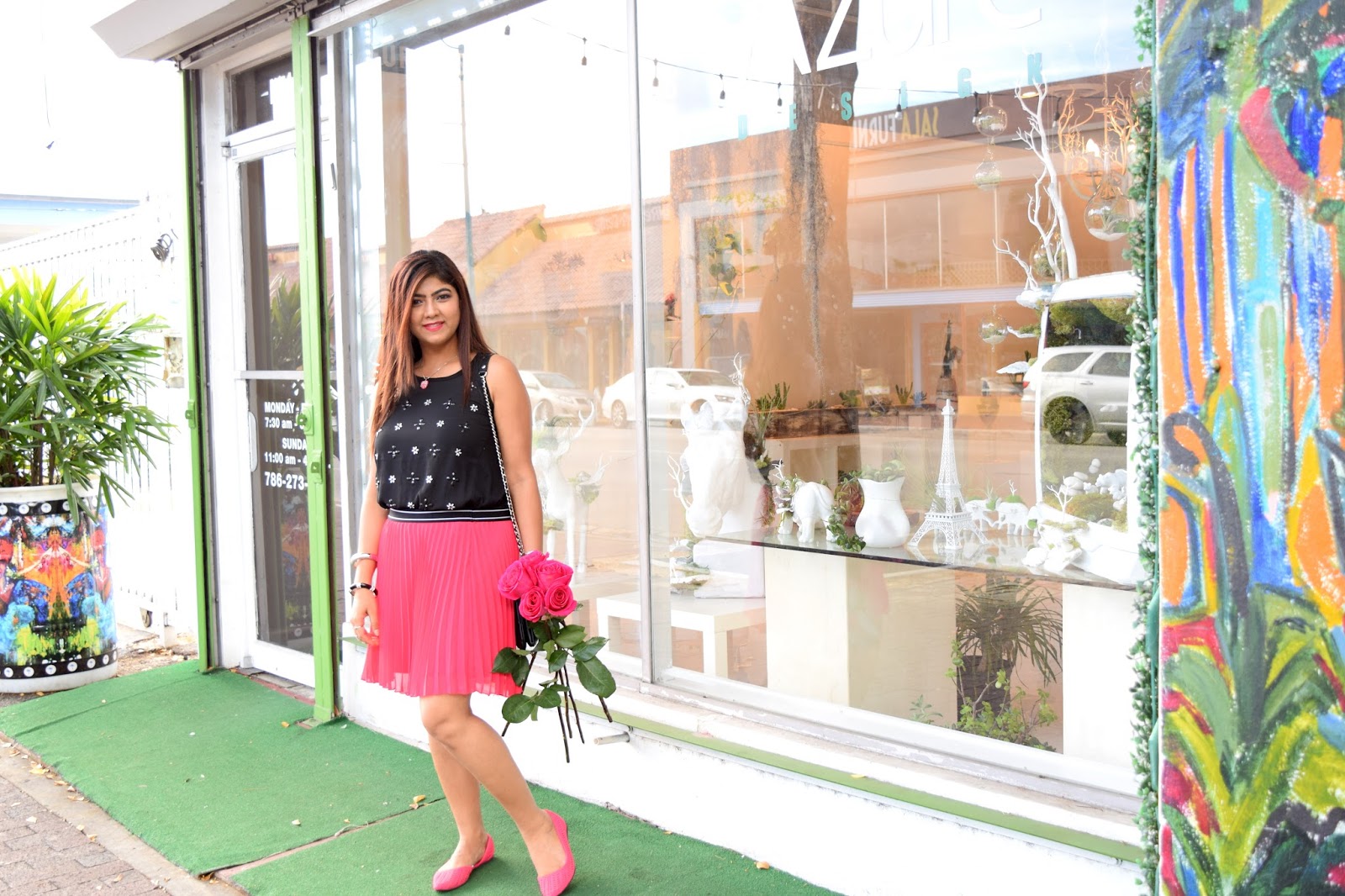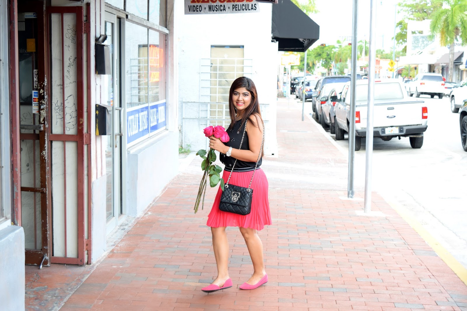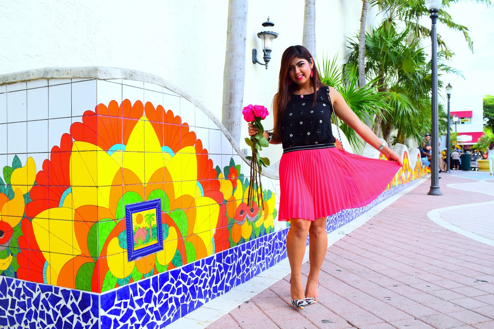 Today I wore a beautifully pleated pink skirt with a black embellished top which compliments it perfectly. Somehow a skirt always makes me feel so girly girl at the same time portraying a perfect form of feminism. Paired it with some super comfy tropical printed pumps and a crossbody and i am all set for my expedition in mini Cuba.
