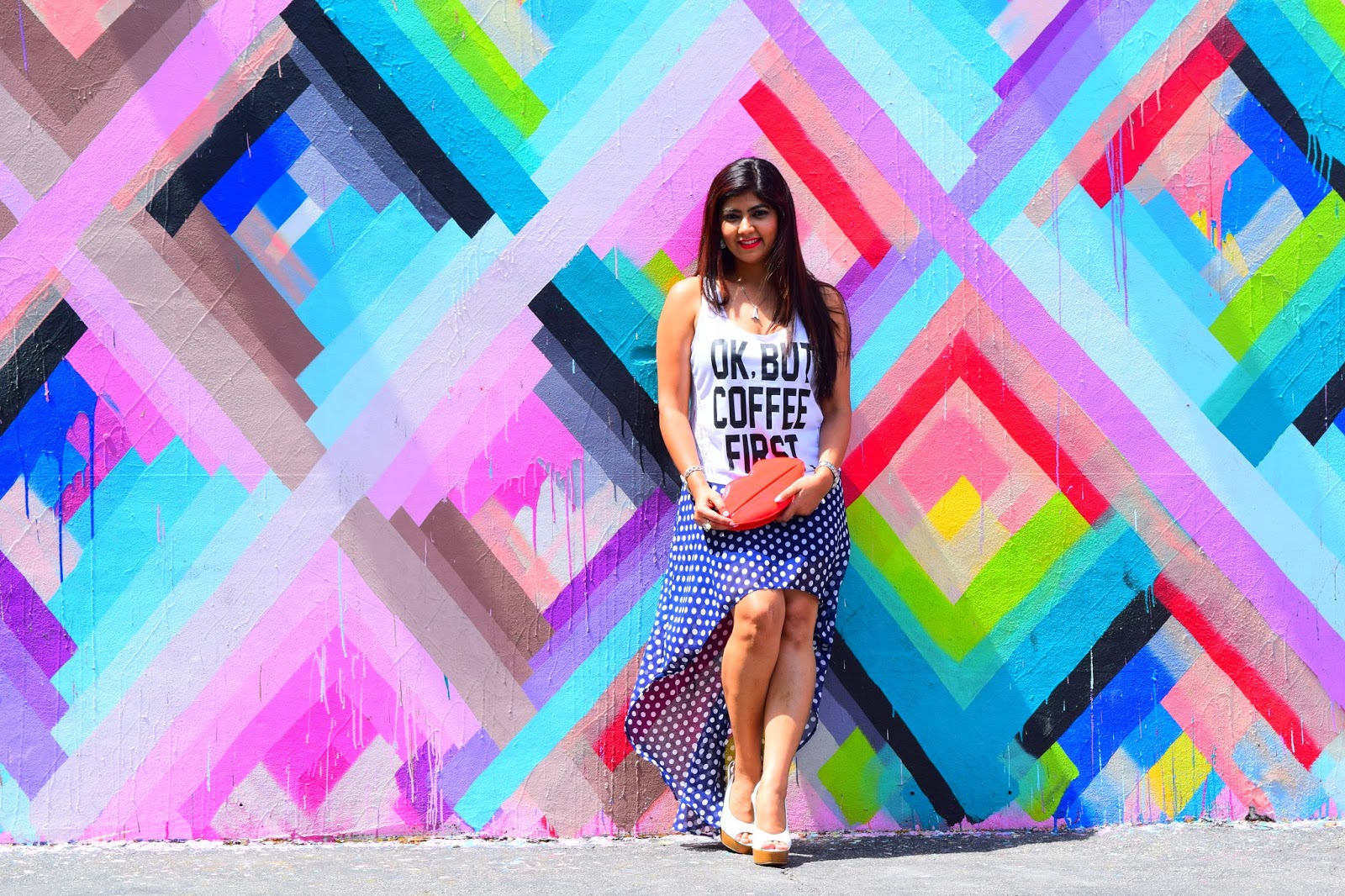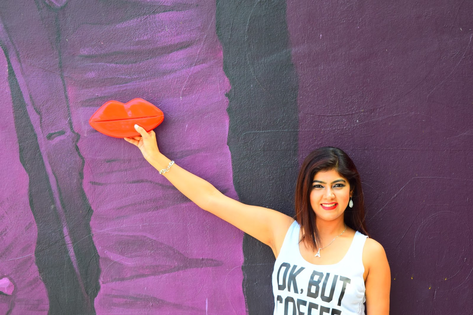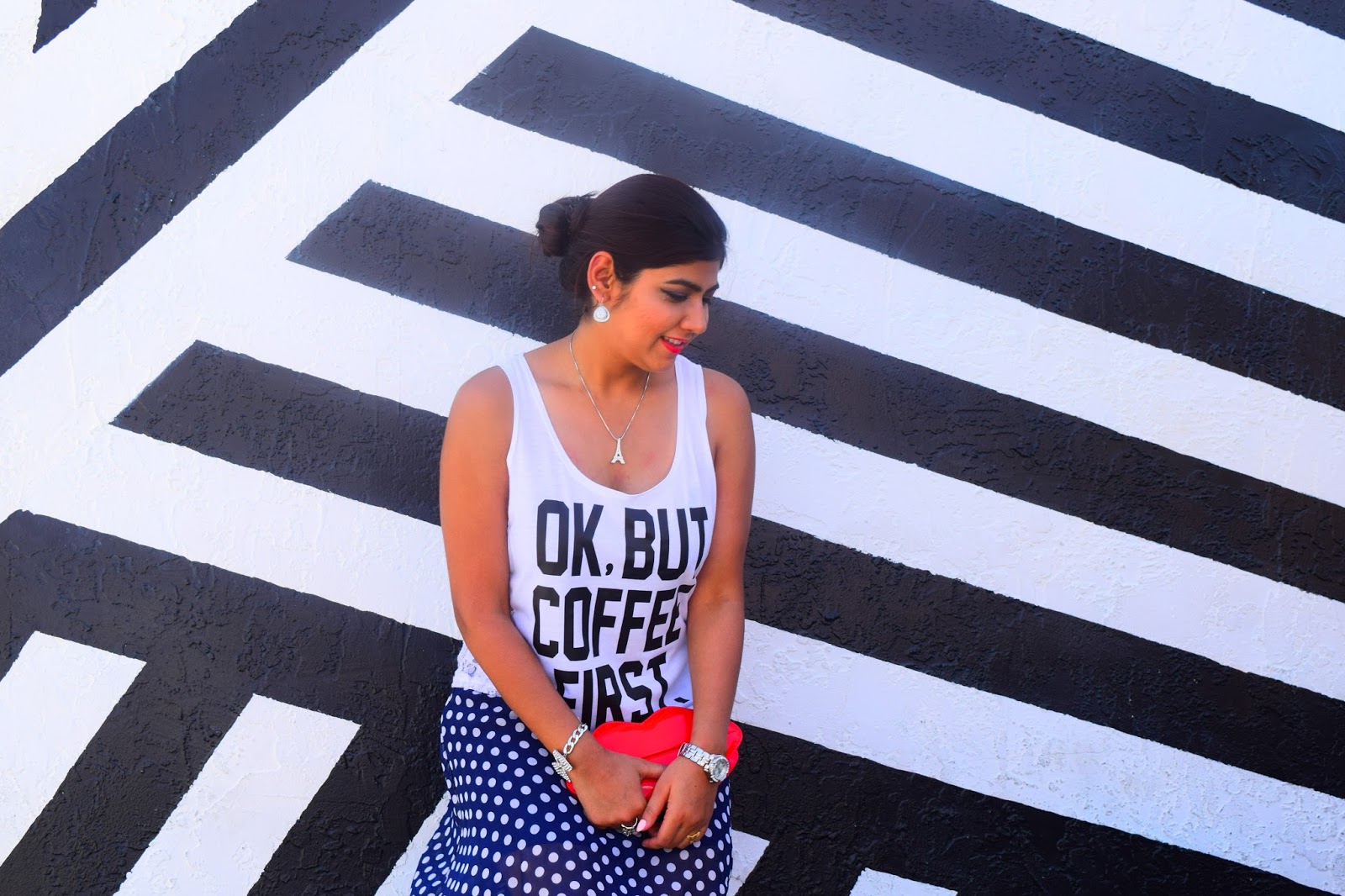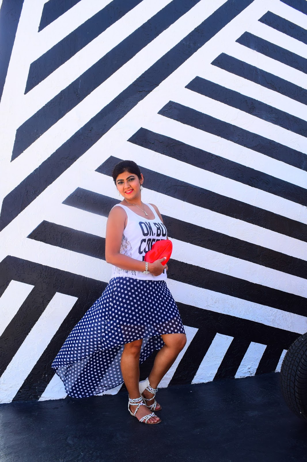 I paired this beautiful, flowy low high skirt with this amazing white top which says”OK, But Coffee First”. This top was a love at first sight… and goes with my lot of other dresses as well. I choose a white high block heels to go with the whole look and added a pop of color with my “Red Lips” clutch. I am so obsessed with my clutch and the funniest thing was, while i was getting clicked a few cute looking girls came to me and asked hesitantly if they could borrow my purse for a few clicks. 🙂